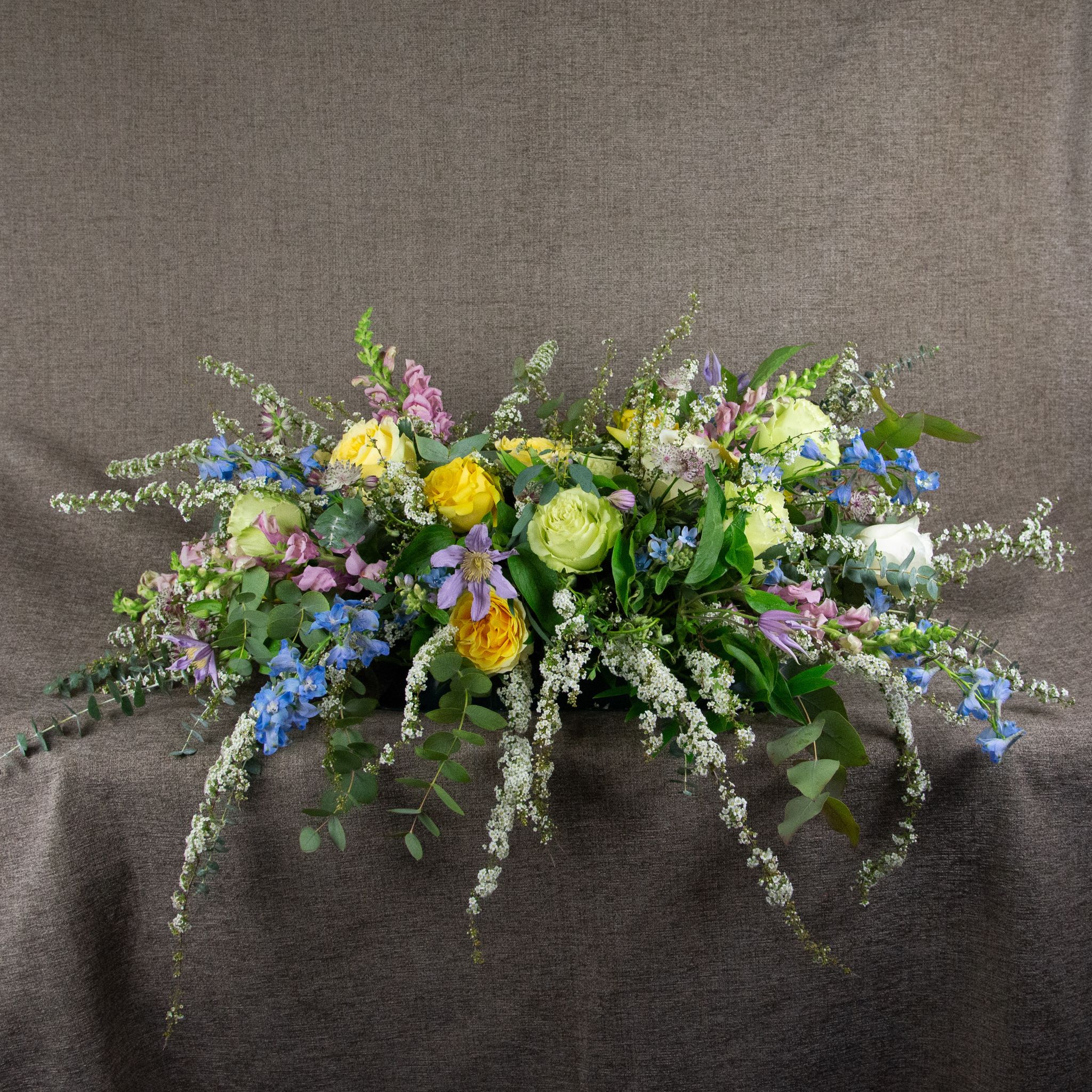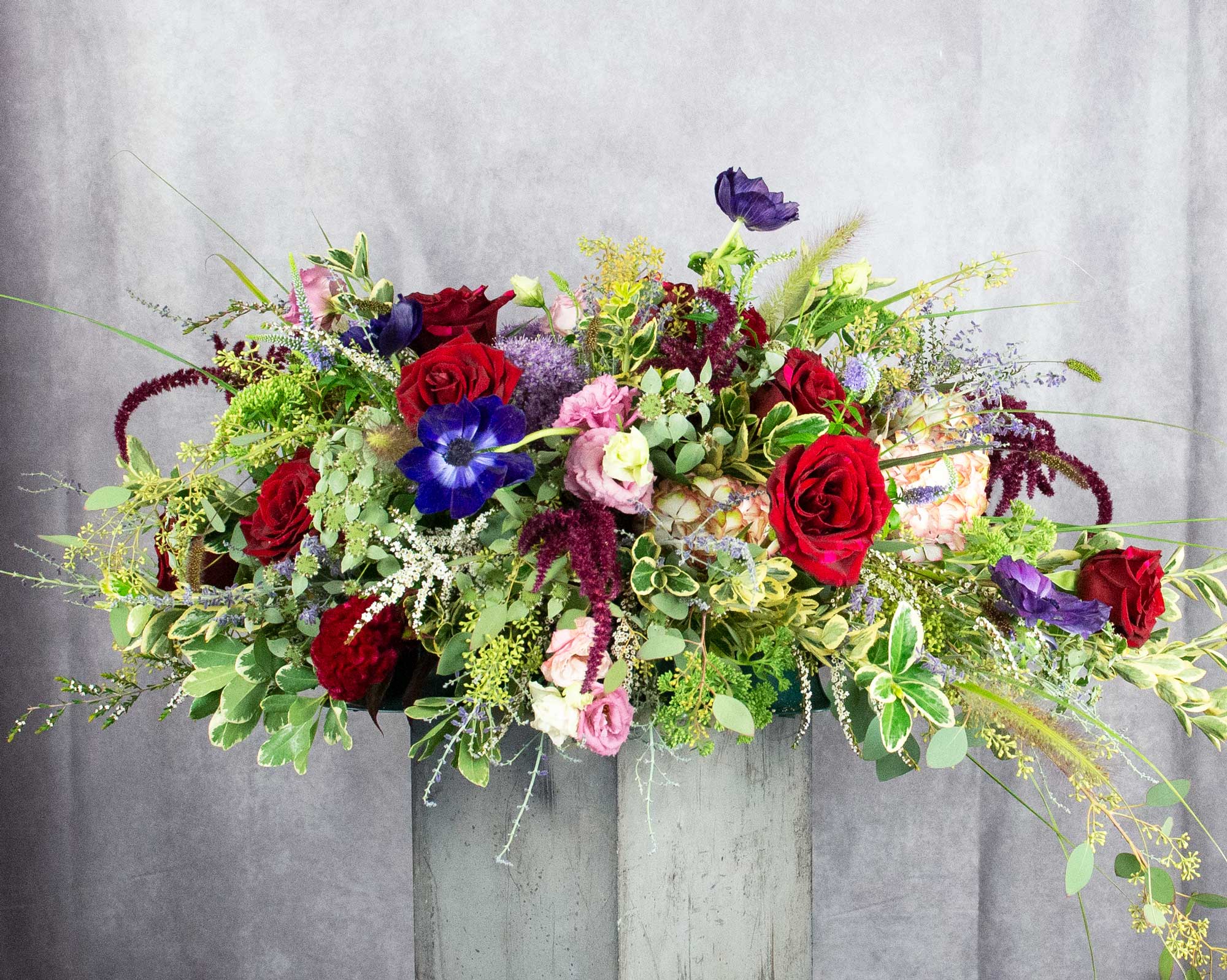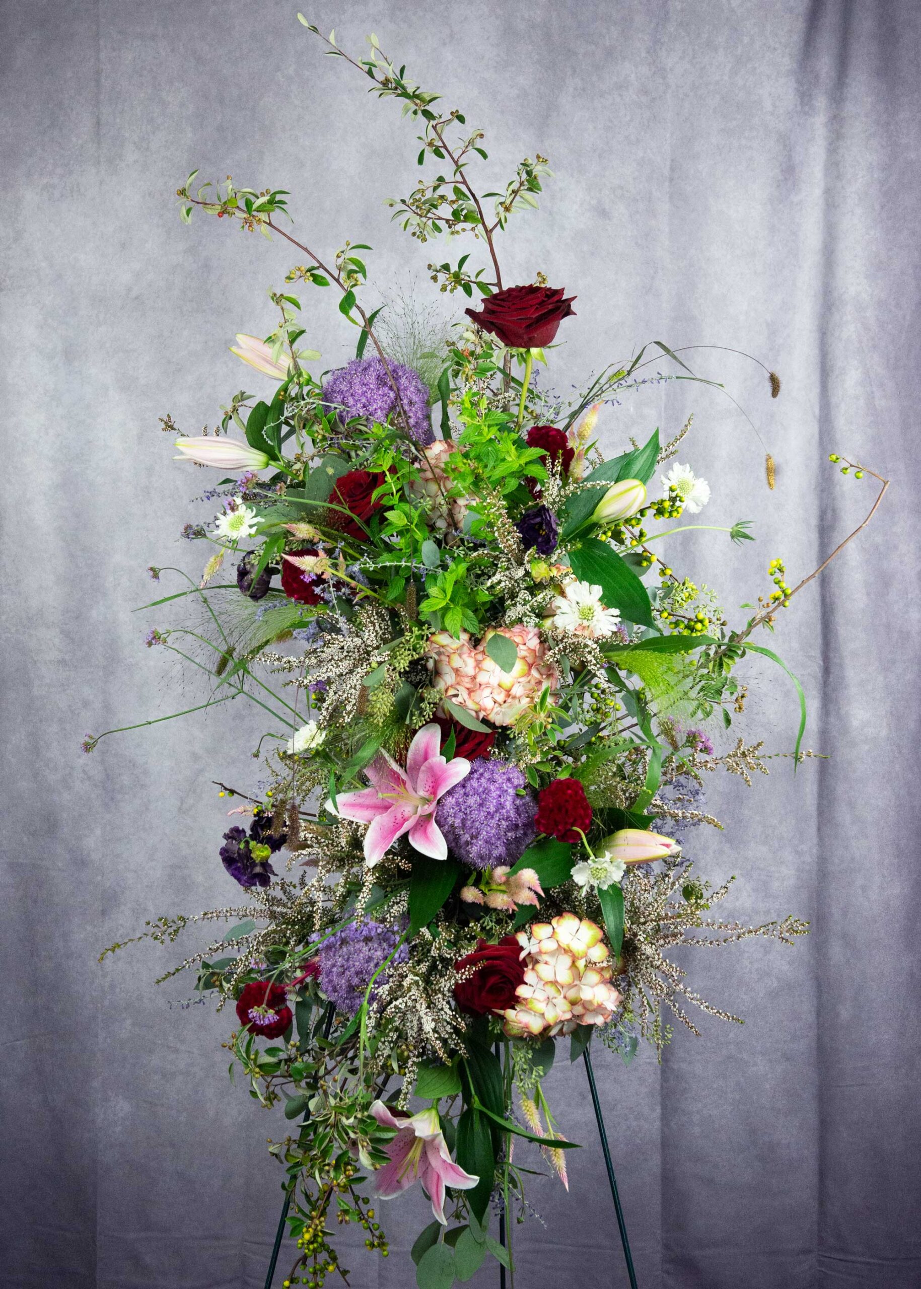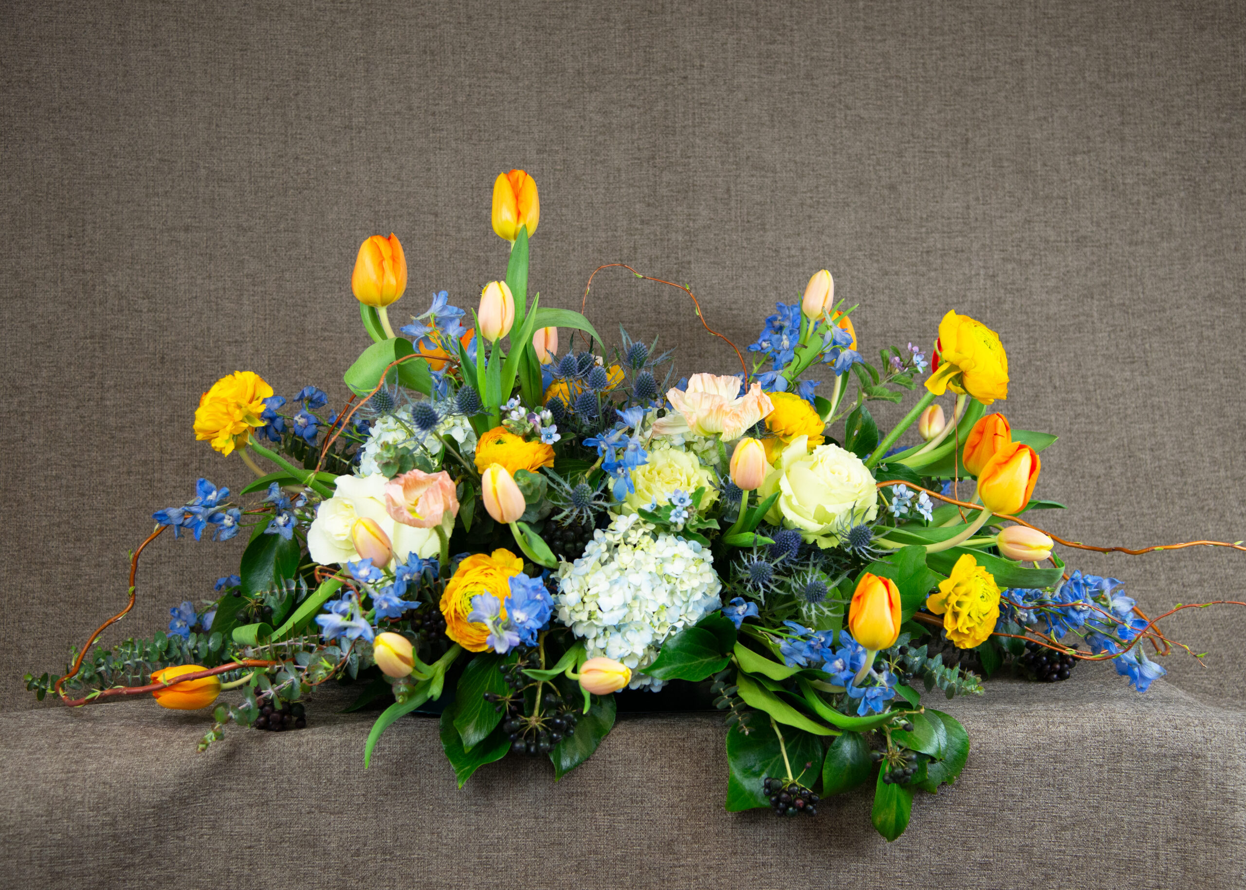 Just as with everything we create, our Celebrations of Life florals are designed as sustainably as possible. While traditional funeral work often relies heavily on floral foam, we strive to avoid it whenever we can—using creative mechanics and natural structures instead. Floral foam is used only when absolutely necessary to achieve a particular design or level of stability.