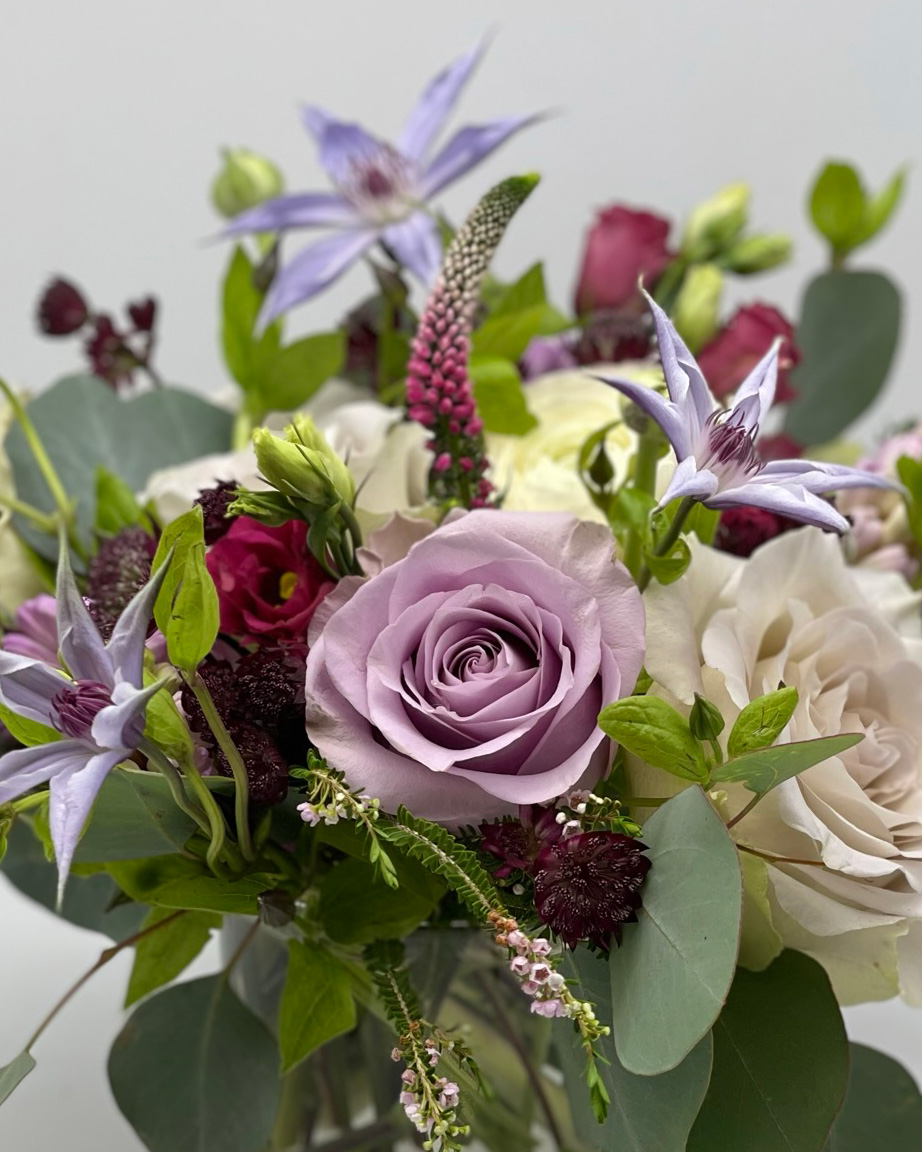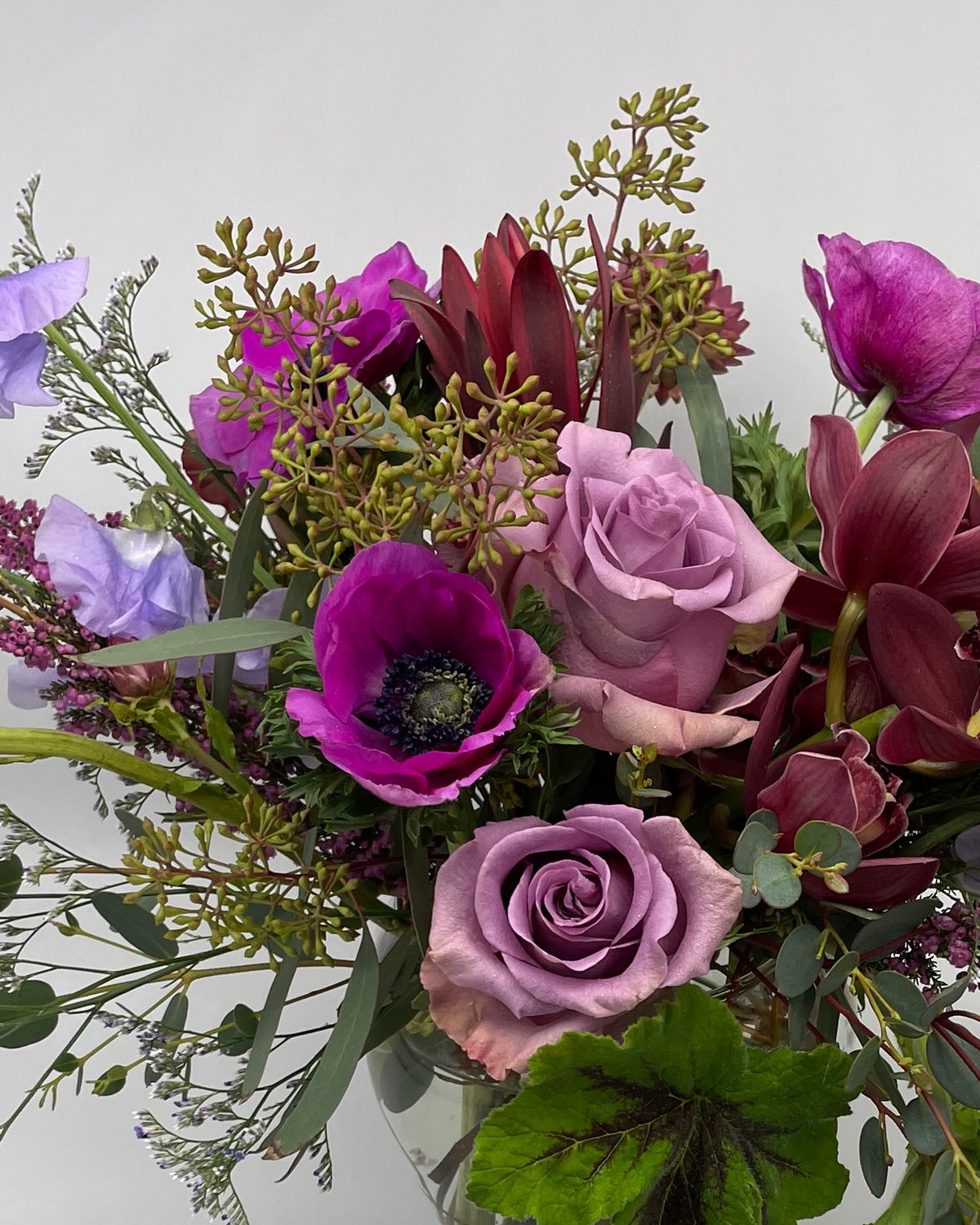 Designed to order using premium seasonal blooms, this arrangement embraces tonal variation and expressive form. While flower varieties may change, the overall mood remains constant—creative, refined, and quietly dramatic.
